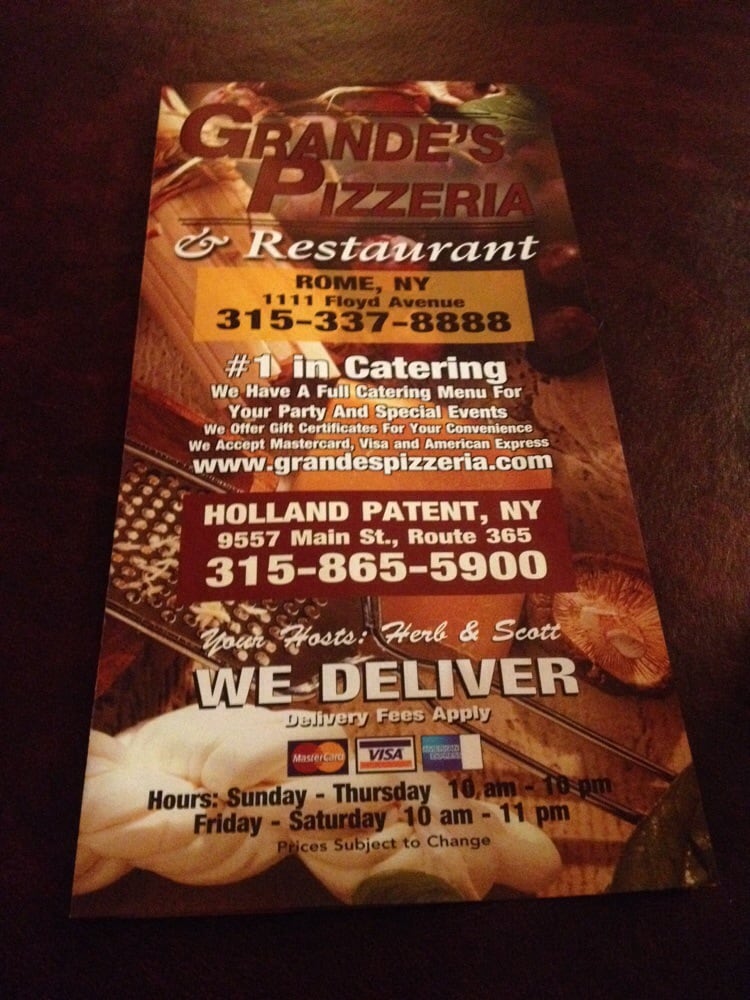Located in Holland Patent, NY, Grande's Pizzeria is a must-visit spot for pizza lovers. Offering a wide range of menu options, including the popular Steak & Cheese, Italian Greens, and Garlic White Pizza, this pizzeria has something for everyone. With a cozy indoor seating area, outdoor seating, and moderate noise levels, Grande's is perfect for groups looking to enjoy a delicious meal. The restaurant also has vegetarian options and accepts credit cards for convenience. Customers rave about the friendly staff and fast service, making it an ideal stop for a quick lunch or dinner. Whether you're passing through town or looking for a nice family dinner spot, Grande's Pizzeria comes highly recommended for its tasty food and inviting atmosphere.